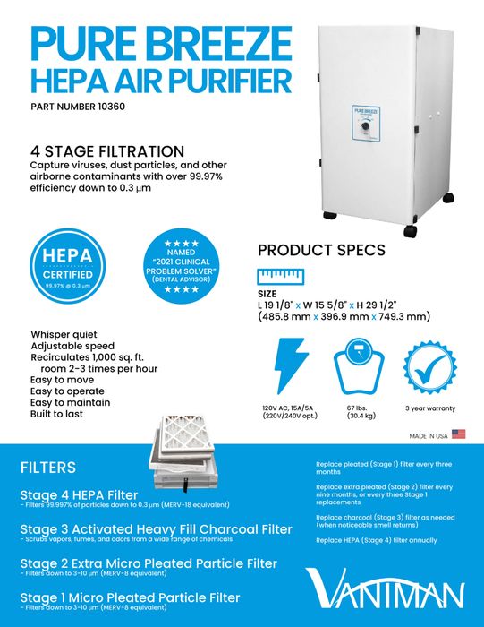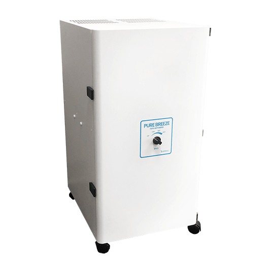 The Pure Breeze HEPA Air Purifier is a portable air purifier that scrubs the air of dust, chemicals, and biological hazards. This laboratory grade HEPA air cleaner is extremely quiet and ideal for many different air filtration applications. It scrubs the air and filters microbes, dust, particulates, fumes, odors, and vapors thanks to a 4 stage filtration system. This unit is half the price and size of comparable industrial air purifiers and is made is USA.