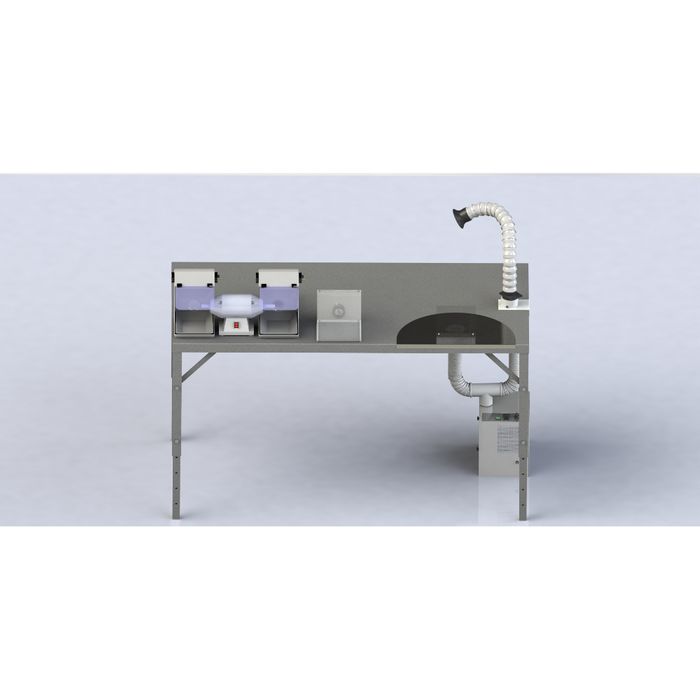 The Downdraft is a bench-top dust collection accessory that creates a semi-enclosed dust collection area when using hand pieces. It features a removable protective shield, padded wrist rests, vent selection, and a padded catch tray. Made from durable Plexiglass and steel.