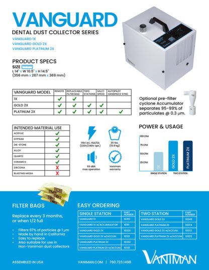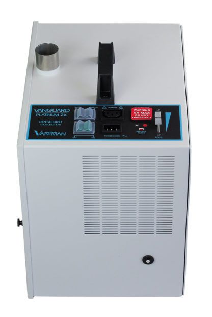 The Vanguard Platinum 2X is a 1-2 station dental dust collector designed to collect dust and particulates at dental workstations. It has a powerful motor with adjustable speed control, replaceable filter bags with « bag-full» indicator light, 3 Stage filtration, and built-in automatic syncing with handpiece operation. It offers a low cost of ownership with the average unit lasting over 20 years. All units are manufactured and assembled, by hand, in the USA at our Southern California facility.